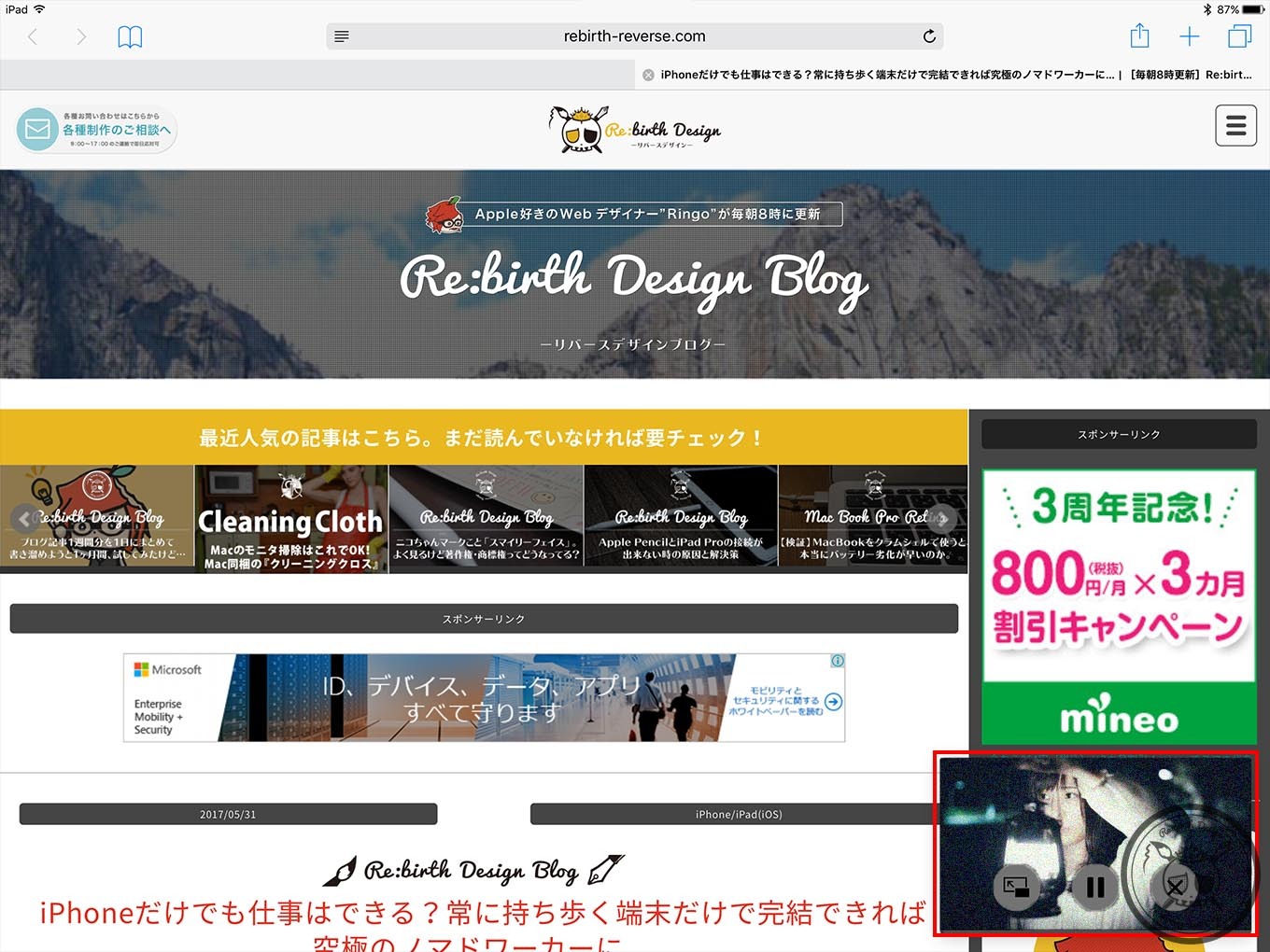 いわゆる「ながら観」をするときに便利な「ピクチャ・イン・ピクチャ」という機能がiPadにはあって、他のアプリ(ブラウザ等)を開いていても画面端に小さく小窓(ワイプ)で動画を表示させることができます。