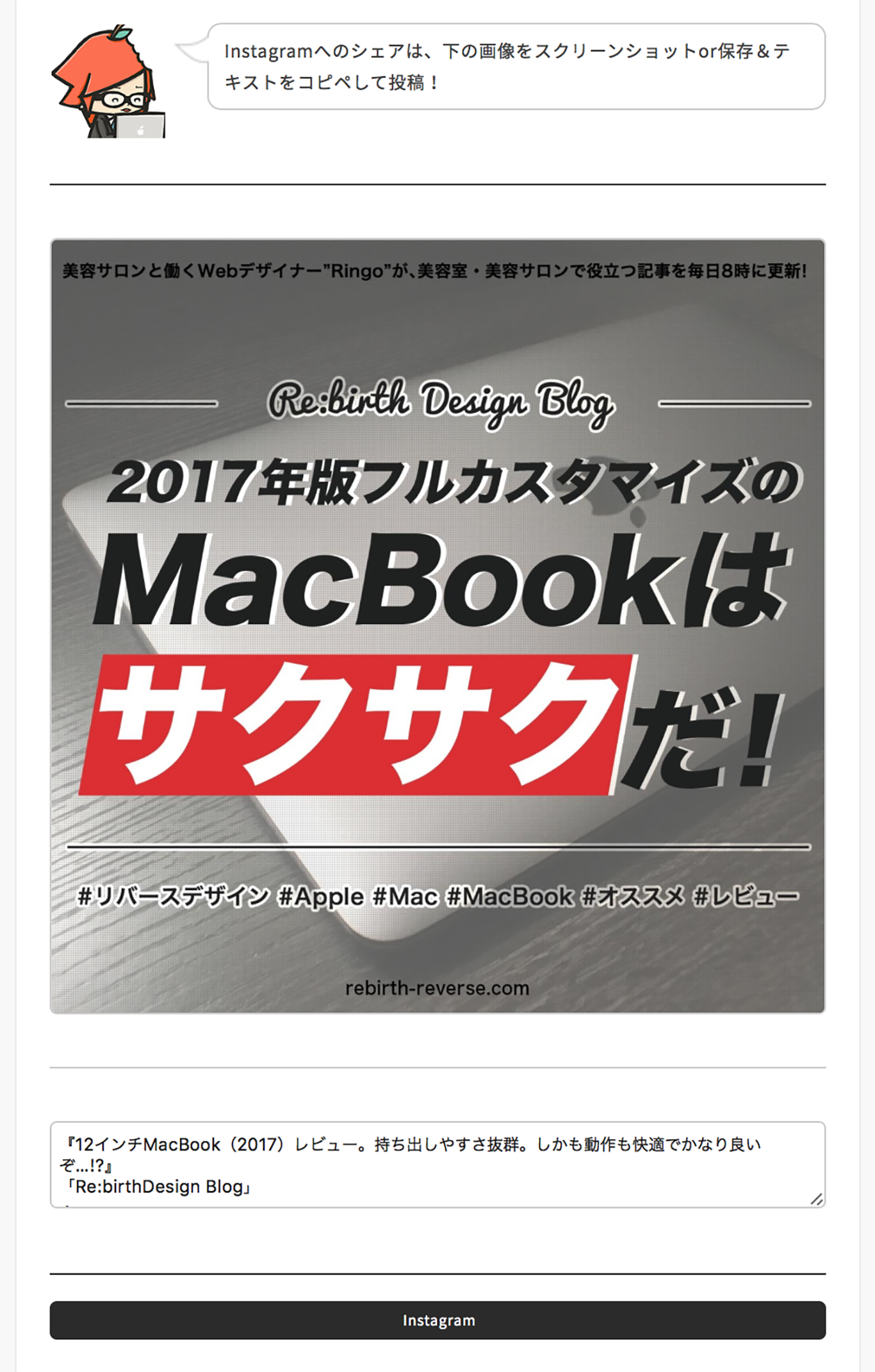 記事下にインスタでシェアしてもらいやすくするためのパーツを設置しました。