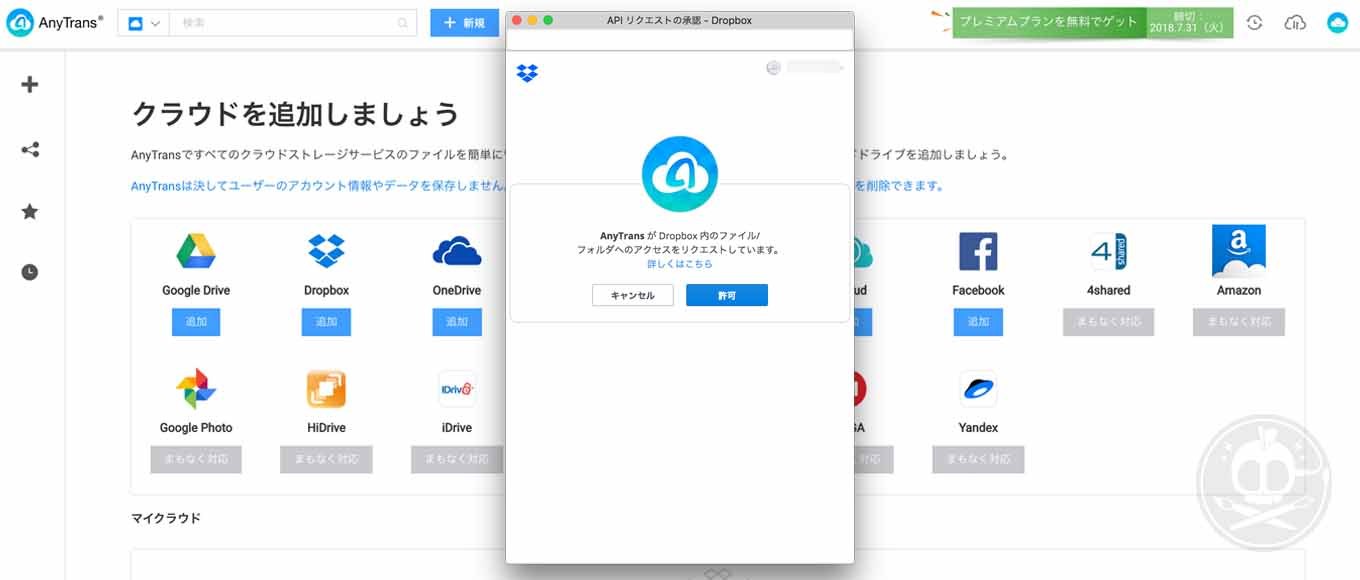 『追加』ボタンを選択して、接続したいDropboxアカウントにログイン、『Anytrans for Cloud』からのアクセスを許可すれば、設定完了。
