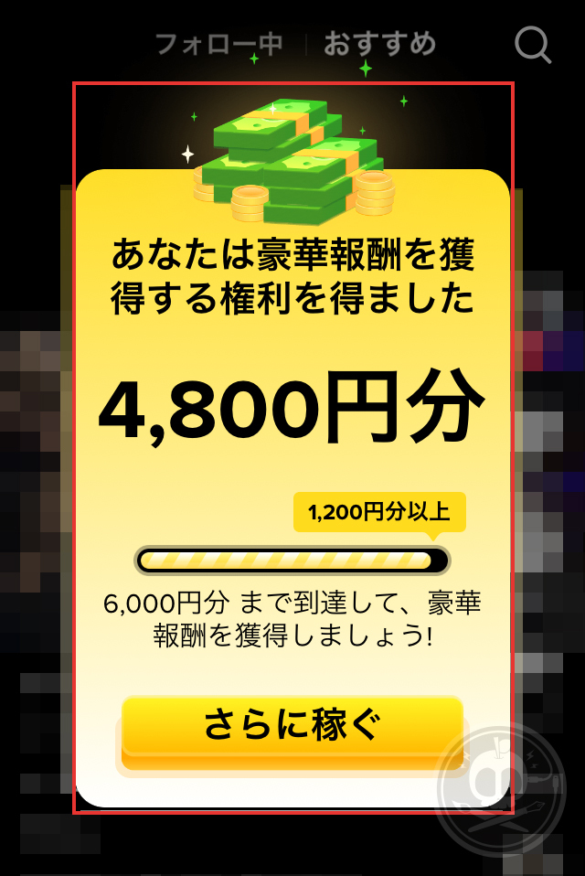 内容は「あなたは豪華報酬を獲得する権利を得ました。6,000円まで到達して豪華報酬を獲得しましょう!」というもの。